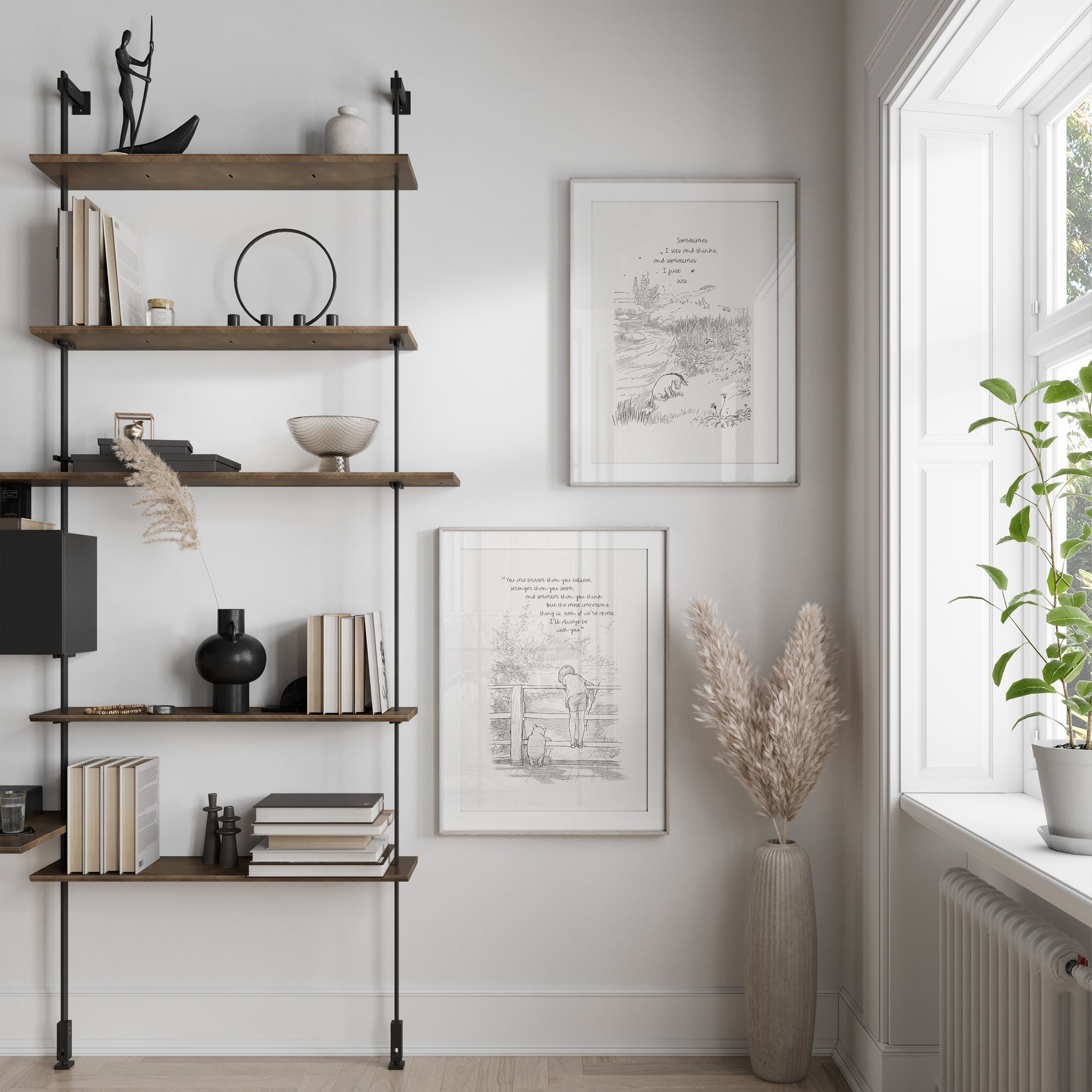 Step back in time to the beloved world of Winnie the Pooh with this meticulously crafted vintage-style black-and-white graphic featuring Winnie the Pooh, Christopher Robin, and Piglet on a bridge playing Poohsticks—a timeless scene from A.A. Milne's classic stories. The illustration is accompanied by an inspiring quote by Carter Crocker: “You are braver than you believe, stronger than you seem, and smarter than you think. But the most important thing is, even if we're apart... I'll always be with you,” reminding us all of our inner strength and resilience.